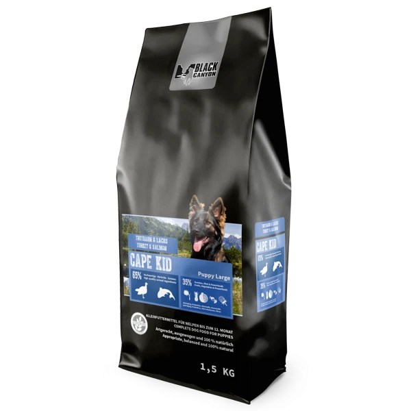 BLACK CANYON Cape Kid Puppy Large Truthahn & Lachs bietet Ihrem kleinen pelzigen Freund von Anfang an eine artgerechte Ernährung mit einem hohen Anteil an tierischen Zutaten. Frisches Truthahnfleisch und leicht verdauliches Lachsfleisch versorgen Ihren kleinen Freund mit hochwertigen Proteinen, die er braucht, um heranzuwachsen. Dazu tragen auch Zutaten wie Bierhefe und Granatapfel bei, die Haut, Fell und Immunsystem Ihres Welpen stärken.