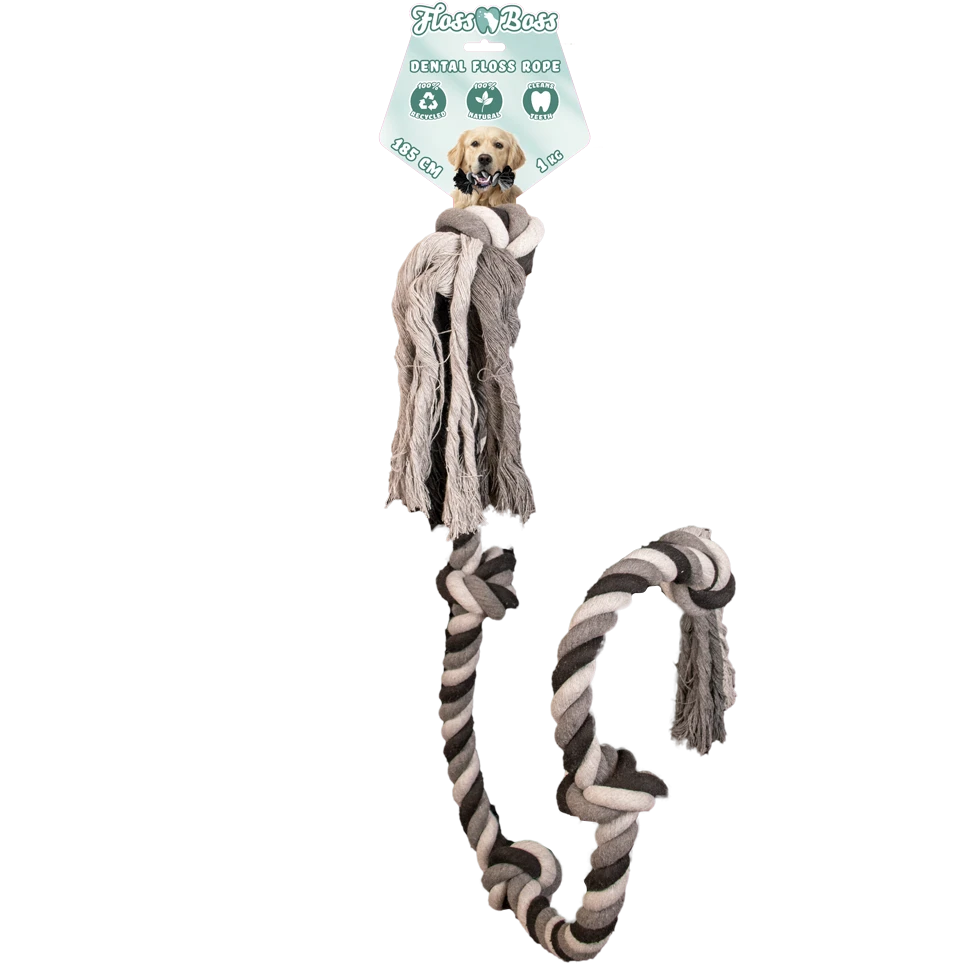 Dieses hochwertige Zahnseil besteht zu 100 % aus natürlicher Baumwolle, wodurch es sicher, langlebig und umweltfreundlich ist. Es eignet sich perfekt für Spiele wie Fangen und Tauziehen mit Hunden. Während des Spielens unterstützt die Zahnseide die Reinigung von Zähnen und Zahnfleisch. Durch eine spezielle Flechttechnik, die ganze Fäden verwendet, ist das Zahnseil besonders fest und stabiler als herkömmliche Zahnseile. Zudem wird es aus recyceltem Material hergestellt, was nicht nur Ihrem Hund, sondern auch der Umwelt zugutekommt.