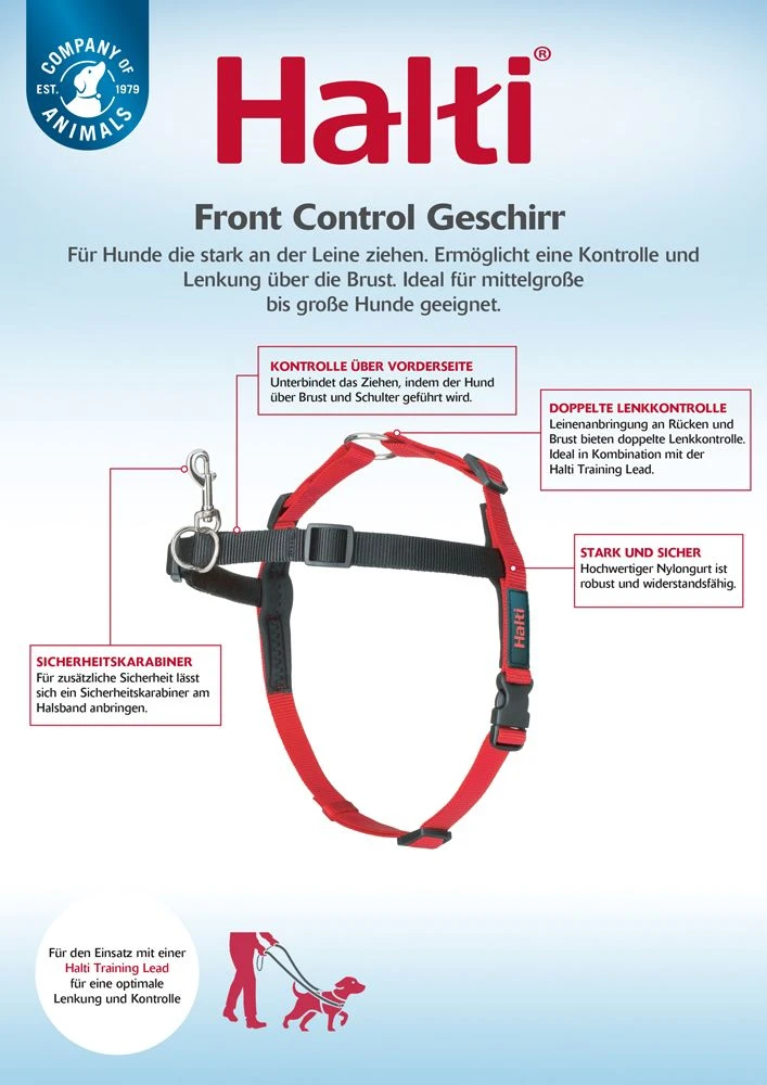 Das Halti Front Control Geschirr wurde von Dr. Roger Mugford entwickelt, es eignet sich für Hunde, die stark an der Leine ziehen und bietet dem/der HundbesitzerIn eine praktische Lösung für mehr Kontrolle.