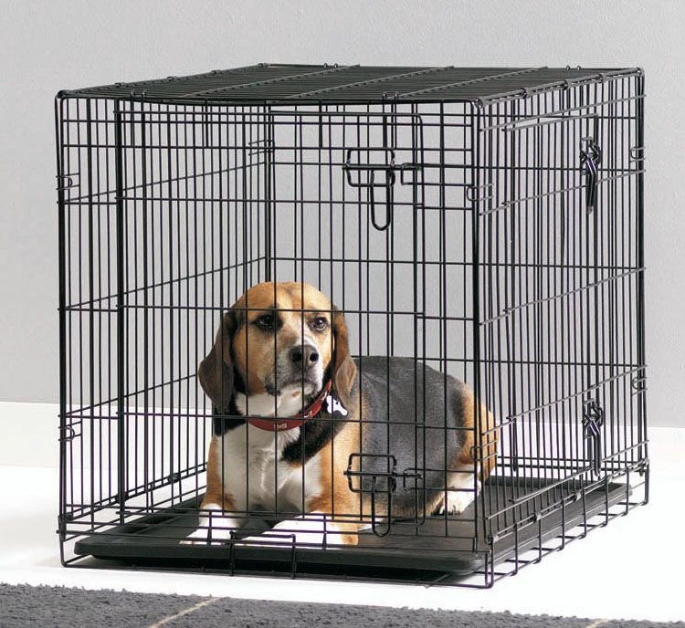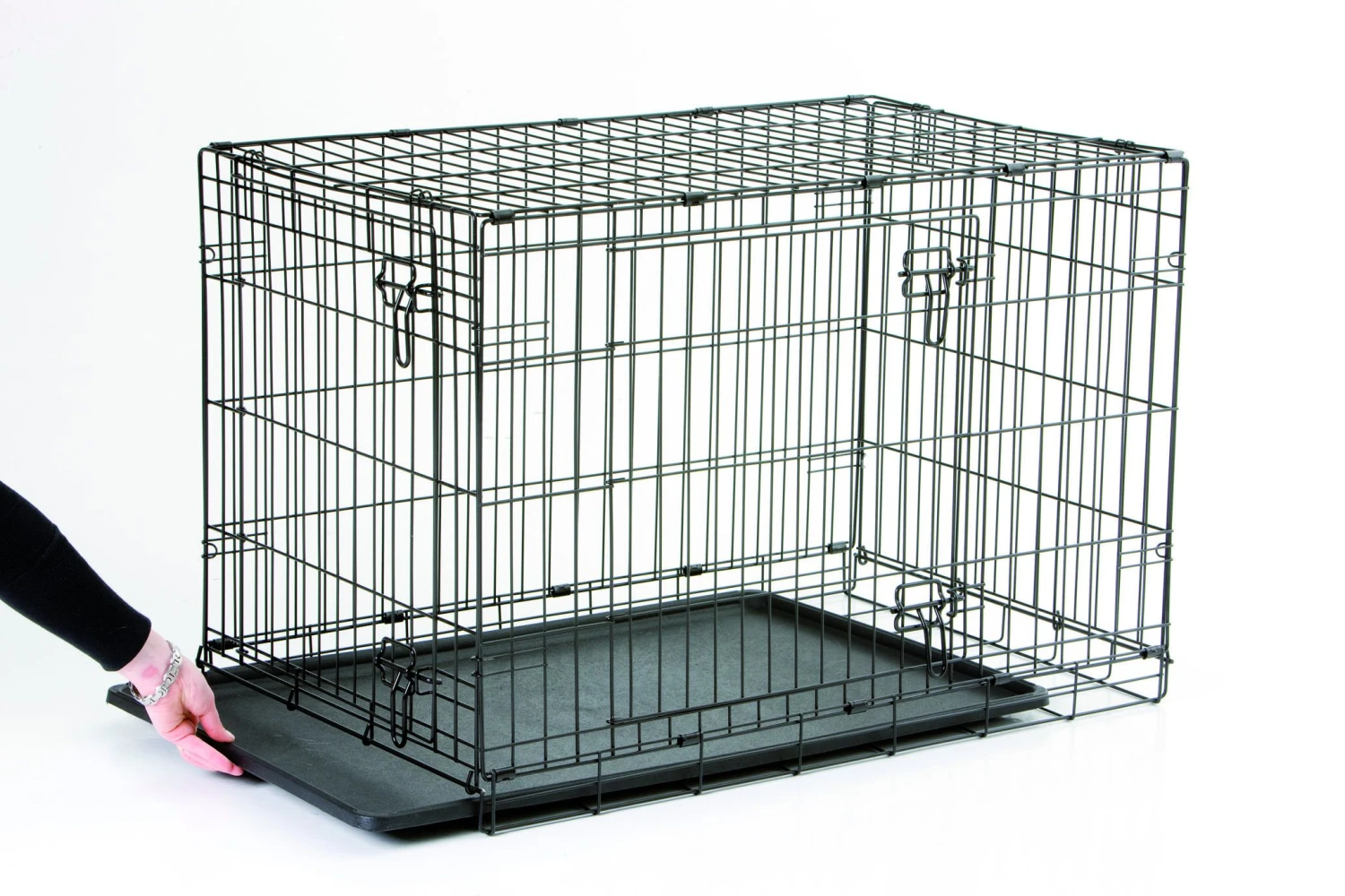 Faltbare Hundekiste aus Metalldraht. Ideal für Reisen oder auch als Rückzugsort zuhause. Jewils mit zwei Öffnungsmöglichkeiten – von Vorne oder von der Seite. Der Kunststoffboden lässt sich einfach entfernen für eine mühelose Reinigung.