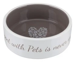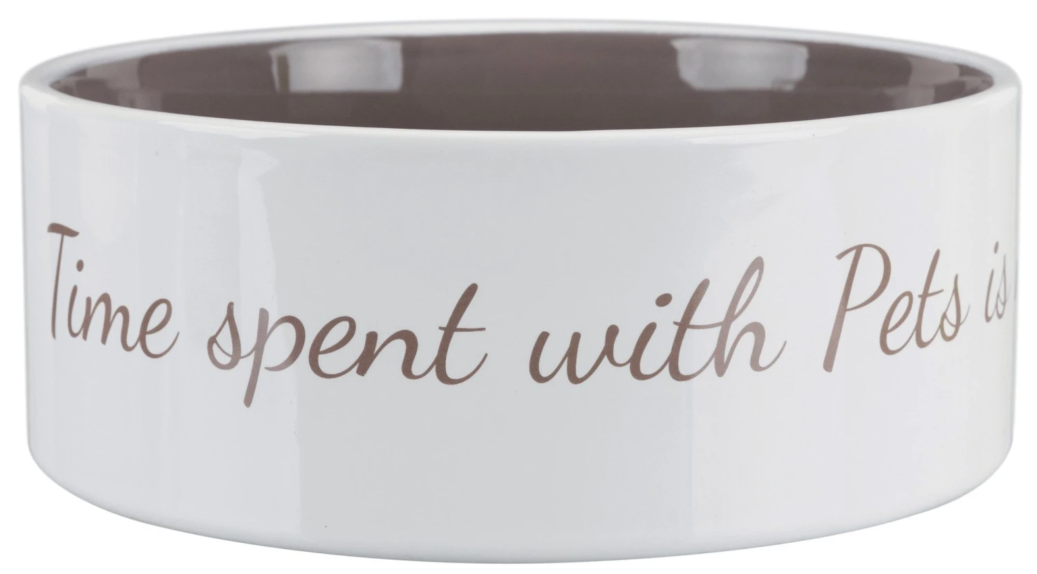 «Time spent with pets is never wasted» ziert diesen Keramiknapf in sanften Farben. Eigentlich Grund genug, den Napf zu kaufen! Aber er besticht auch mit richtig guten Fakten: Hoher Rand als Kleckerschutz, hohes Eigengewicht für Stabilität, sowie runde und glatte Innenwände, um Futterreste zu vermeiden. Dieser Napf ist vor allen Schleckattacken gefeit!