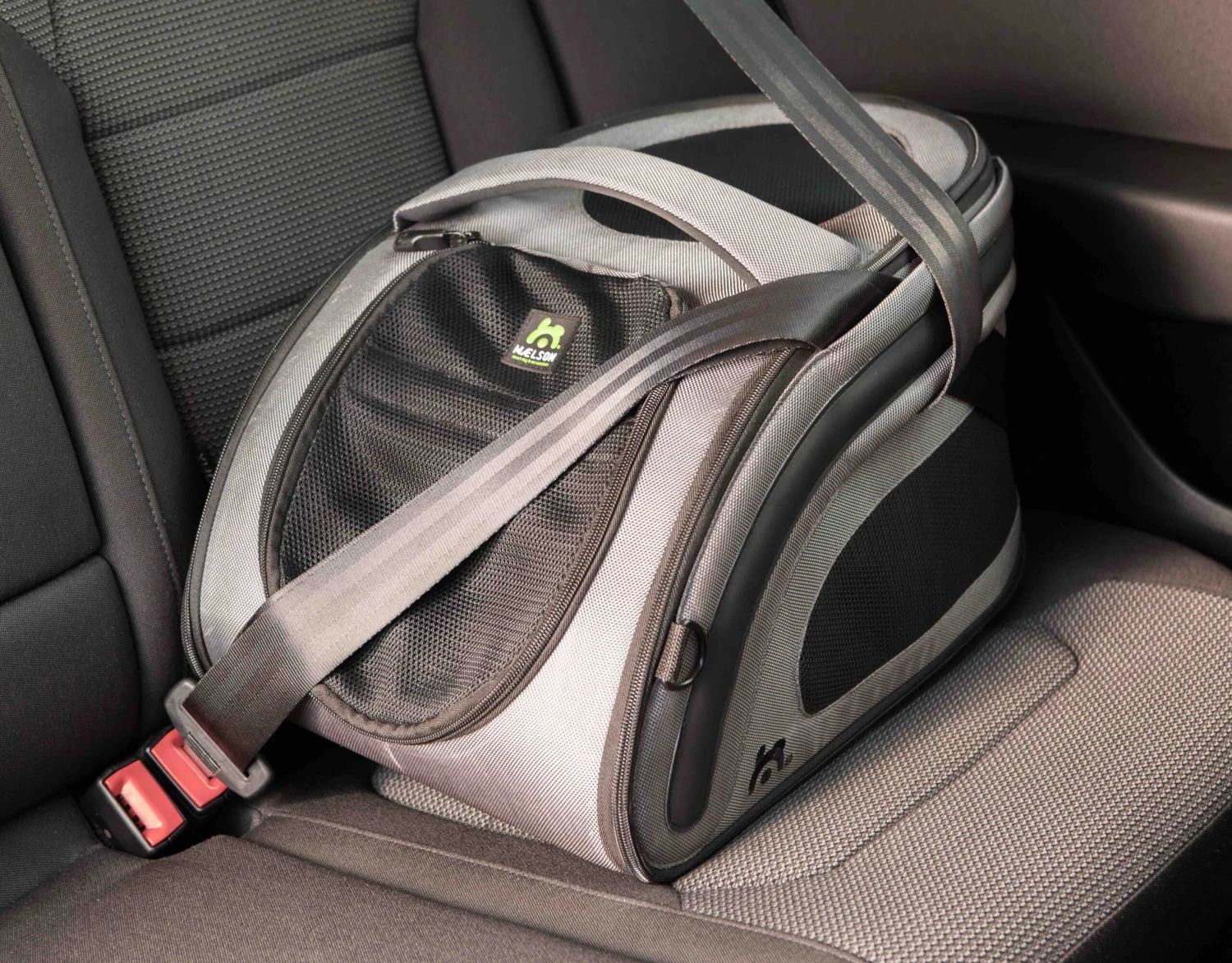 Faltbare und leichte Stofftransportbox. Als Handgepäck in der Fluggastkabine geeignet. Gepolsterter und regulierbarer Schultertragegurt. Strapazierfähiges Meshgewebe an den Seiten und der Oberseite für ausreichende Belüftung. Qualitäts-Reissverschlüsse für bequemen Gebrauch und Langlebigkeit. Seitenhalterungen zur Befestigung an ausziehbaren Koffergriffen oder im Auto mittels des Sicherheitsgurtes. Eingang lässt sich weit öffnen und kann in der Offenstellung dank eingebauter Magnetstreifen fixiert werden. Leinenhalterung im Inneren. Bequeme Plüschmatte mit wasserabweisender Einlage.