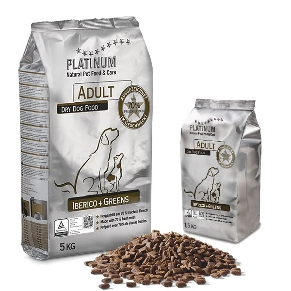 Ihr Hund verdient nur das Beste, oder? Dann ist Platinum Adult Iberico Greens genau das Richtige für ihn: Platinum ist eine einzigartige Hundevollnahrung, die aus 70 % Schweinefleisch (ausschliesslich vom iberischen Schwein) besteht, dazu Kartoffeln und getrocknetes Gemüse. Das iberische Schwein ist bekannt für seinen unvergleichlichen Geschmack und seine hohe Akzeptanz. Für Platinum wird nur Frischfleisch verwendet, das auch für Menschen geeignet ist. Das Frischfleisch wird nur einmal erhitzt und mit einer speziellen Methode im eigenen Saft gegart. So bleiben die natürlichen Aromen und die hervorragende Nährstoffqualität erhalten. Vitamine, Fette, kaltgepresste Oele und wertvolle Kräutermischungen werden erst bei Raumtemperatur hinzugefügt und bleiben so in ihrem natürlichen Zustand. Platinum Adult Iberico Greens ist eine Hundevollnahrung, die Ihrem Hund einen unvergleichlichen Geschmack und eine hohe Akzeptanz bietet. Sie ist optimal für seine Gesundheit, da sie eine natürliche Zusammensetzung hat. Sie ist auf dem Niveau von menschlicher Nahrung und deshalb mehr als nur Hundefutter, denn für den besten Freund ist nur das Beste gut genug.